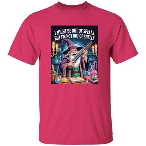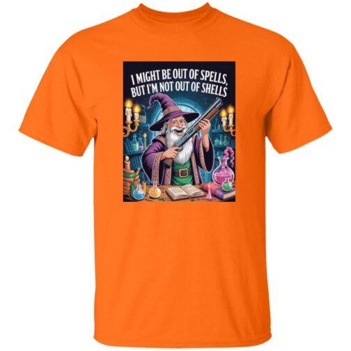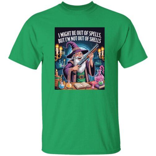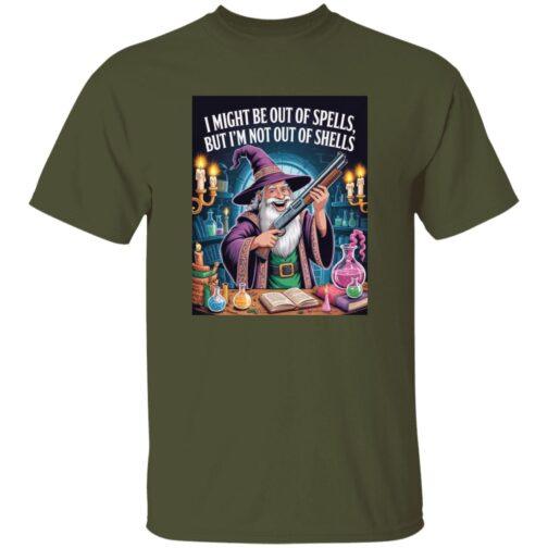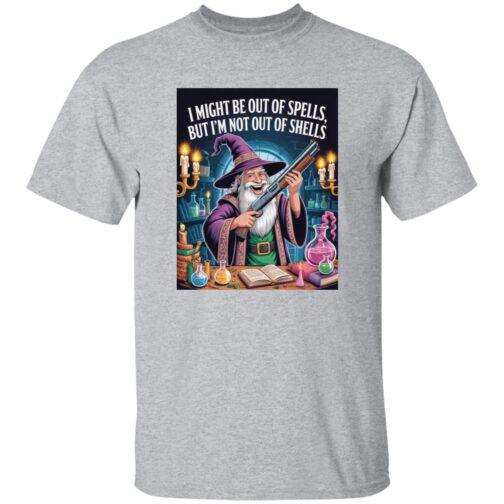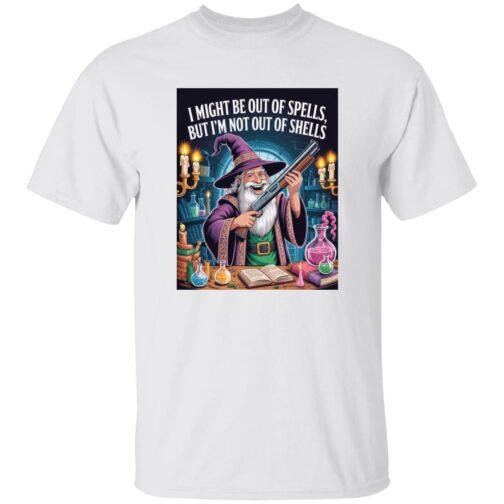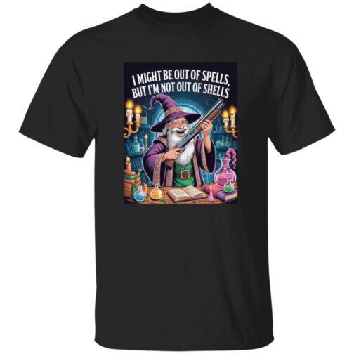 Funny Wizard with Shotgun T-Shirt | “Out of Spells, Not Out of Shells” D&D Gamer Graphic Tee | Fantasy RPG & Tabletop Gaming Apparel for Men & Women